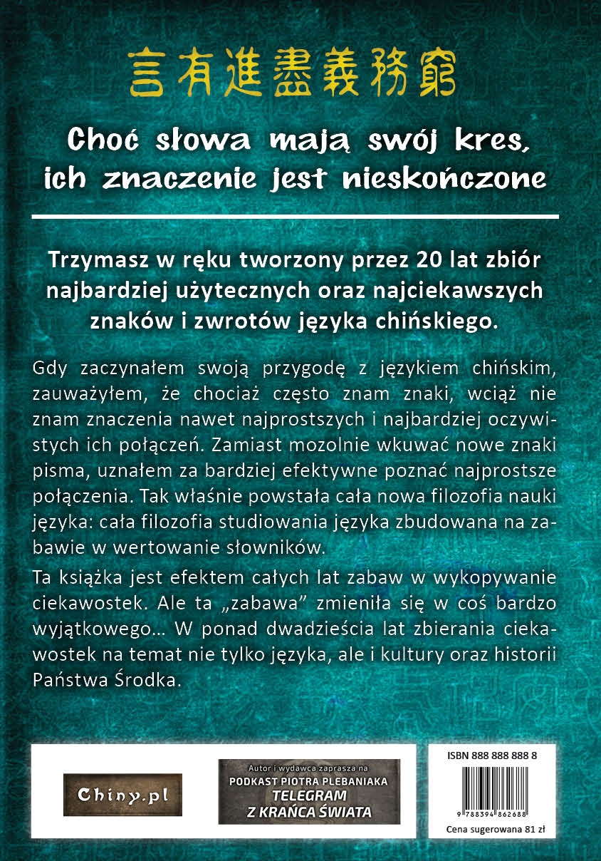 Tak właśnie powstała cała nowa filozofia nauki języka: cała filozofia studiowania języka zbudowana na zabawie w wertowanie słowników. Ta książka jest efektem całych lat zabaw w wykopywanie ciekawostek. Ale ta „zabawa” zmieniła się w coś bardzo wyjątkowego… W ponad dwadzieścia lat zbierania ciekawostek na temat nie tylko języka, ale i kultury oraz historii Państwa Środka.