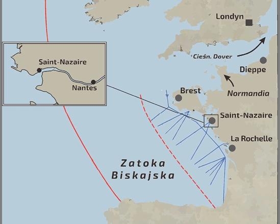 Ryc.1. Mapa Zatoki Biskajskiej i obszaru wybrzeża okupowanej Francji.