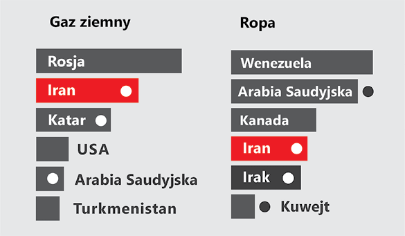 Ryc. 2. Potencjał Iranu w kwestii zasobności złóż gazu ziemnego i ropy – w rankingu sześciu państw o największych rozpoznanych złożach. Nota: wykres celowo pomija wielkość bezwzględną złóż, gdyż liczy się udział w globalnych zasobach. Kropka oznacza kraj regionu Zatoki Perskiej, której wylot kontrolowany jest przez Iran.